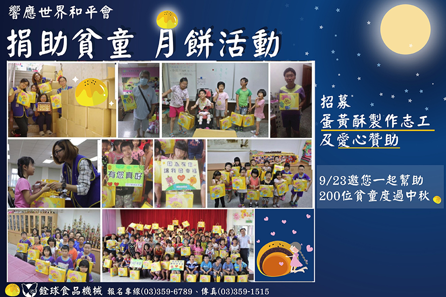 銓球與世界和平會合作的愛心月餅活動,今年也圓滿落幕了。感謝所有播空參與這項活動的志工們及贊助善款和製作原料的民眾及企業,一共完成約2950顆蛋黃酥,將送到世界和平會並轉交給貧弱家庭的兒童,讓他們度過美好的中秋佳節。贊助的結餘款項也將全數捐出給世界和平會,提供偏遠地區兒童穩定的午餐供應,期望立足於烘焙設備界的我們能一年年持續辦下去,為這世界帶來溫暖的力量。 特別感謝麥田金、鼎味豬腳飯、緯柏國際貿易有限公司、豐麥麵粉、欣欣舞蹈協會、劉郁玟、黑心手作馮凱瑄師傅、維也納專業烘焙的呂漢智老闆和廖子緣師傅、王湮師傅,以及所有參與這項活動的志工及愛心贊助。